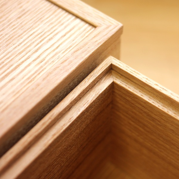 フタと箱の四隅はトメ加工を施してあります。トメ加工とは直角に接合する部材同士を45°にカットして突き合わせる加工です。強度を保持しつつ美しい仕上がりとなります。(写真:タモ)