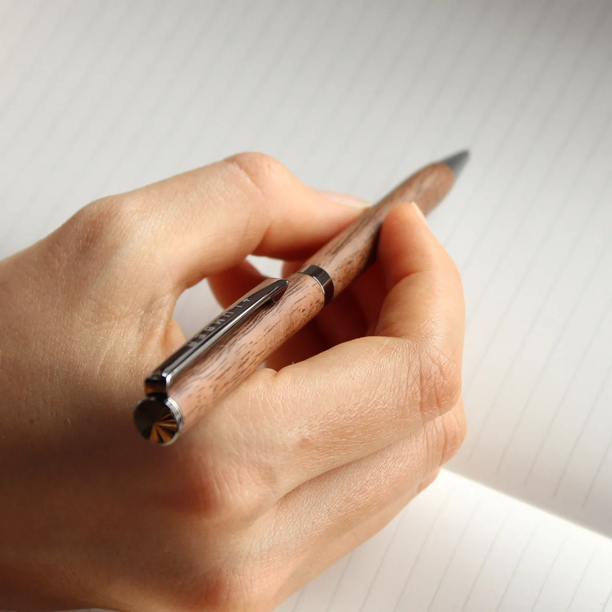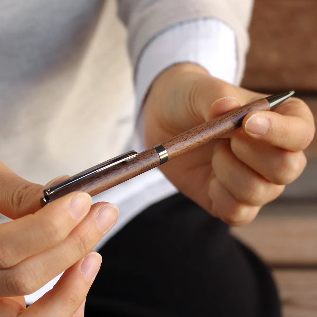 回して出し入れする回転・ツイスト式の木製ボールペン。