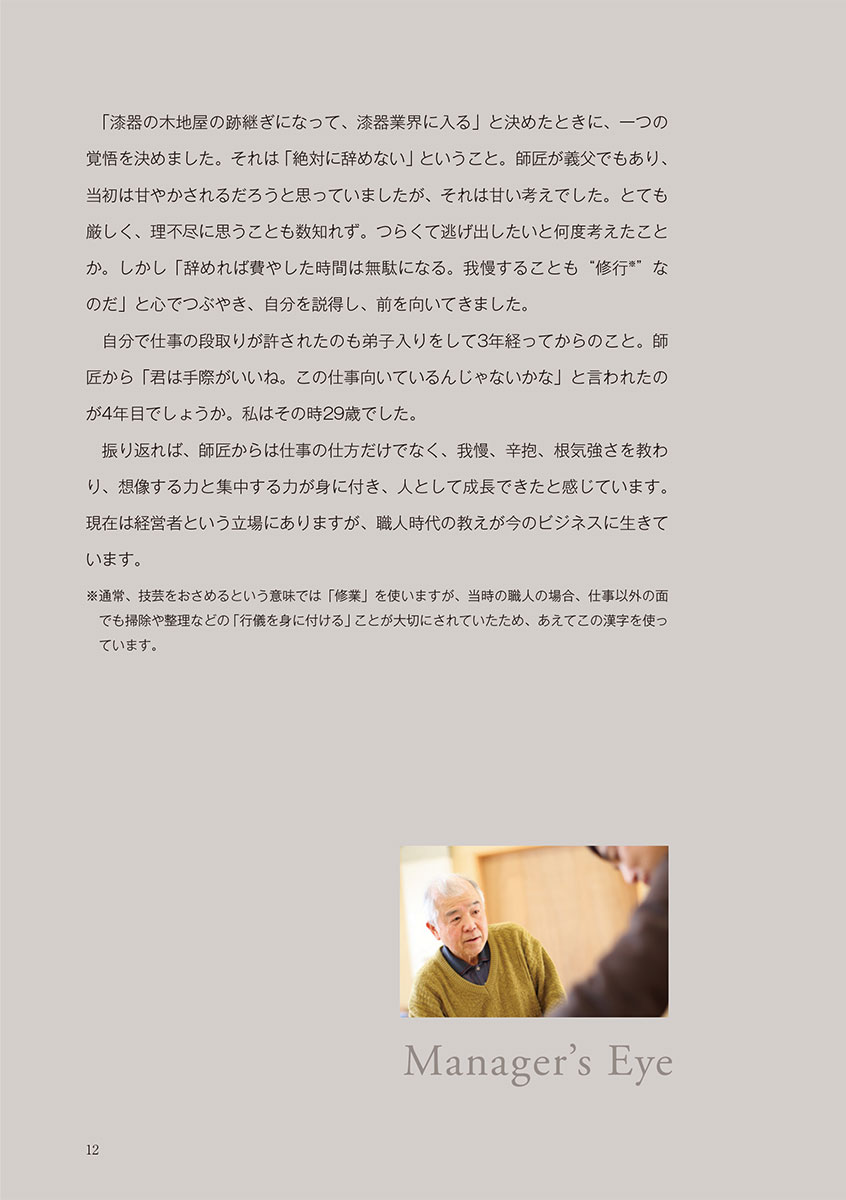 伝統工芸の技術を礎にしながら時代と顧客に求められる商品展開によりコアなファン層を獲得。その卓越したビジネスセンスは多方面から注目を浴び続けている。