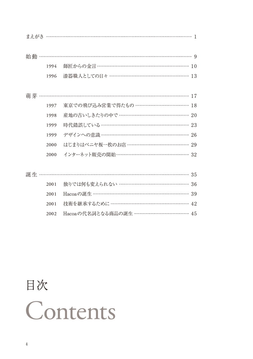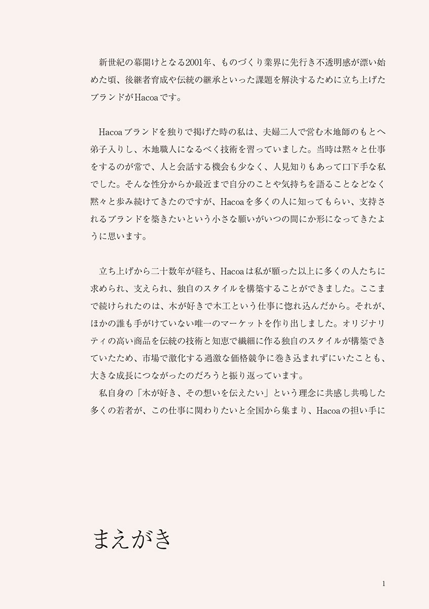 ガレージファクトリーでのものづくりとフリーマーケットでの販売を経て、2001年に「Hacoa」ブランドを起ち上げる。