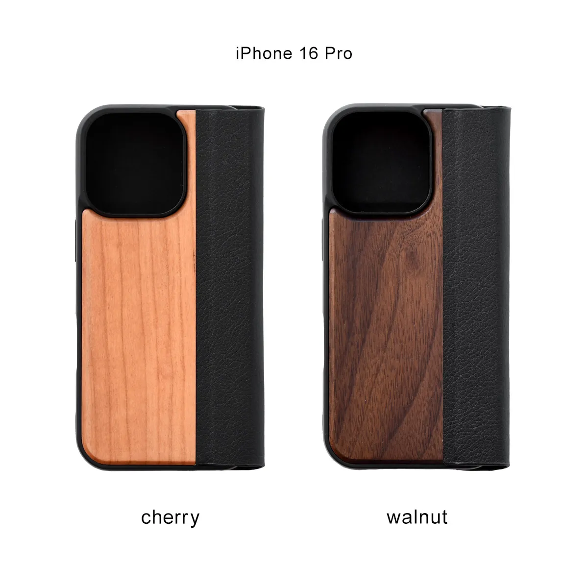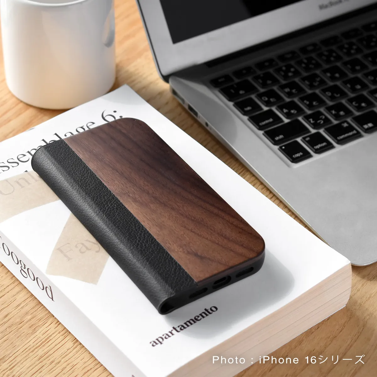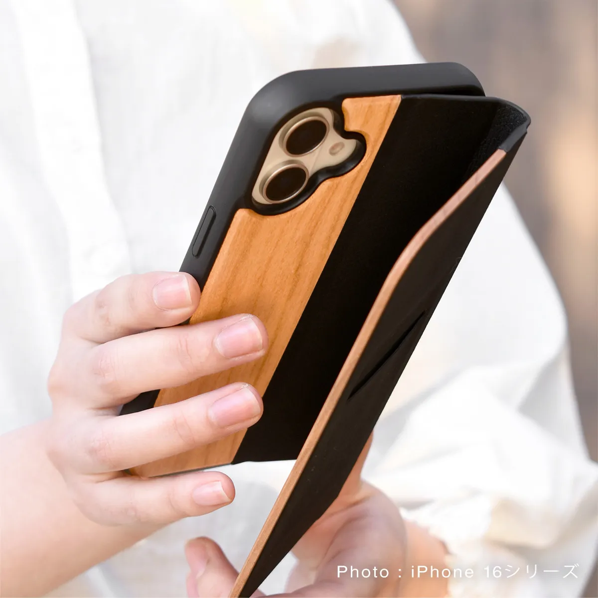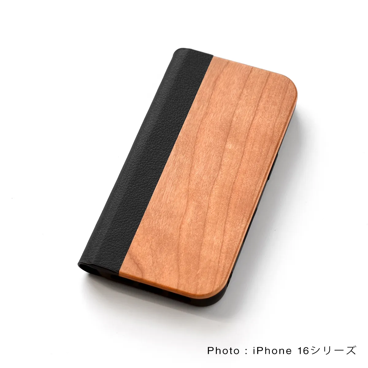手帳型の木製アイフォンケース、iPhone 16シリーズ専用フリップケース