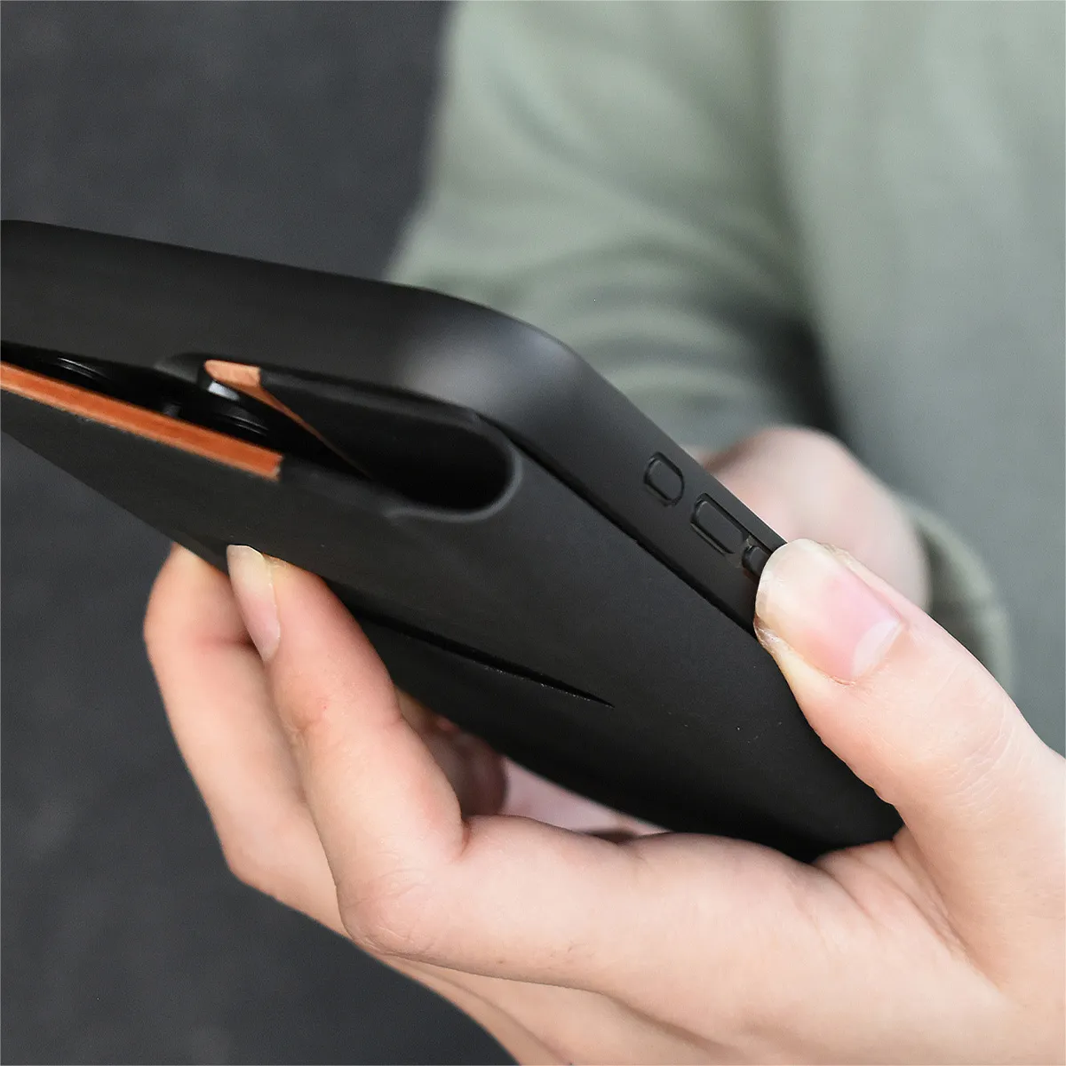 ※厚手のカードを複数入れたり、無理に引っ張りますと革と木板が剥がれる原因となります。