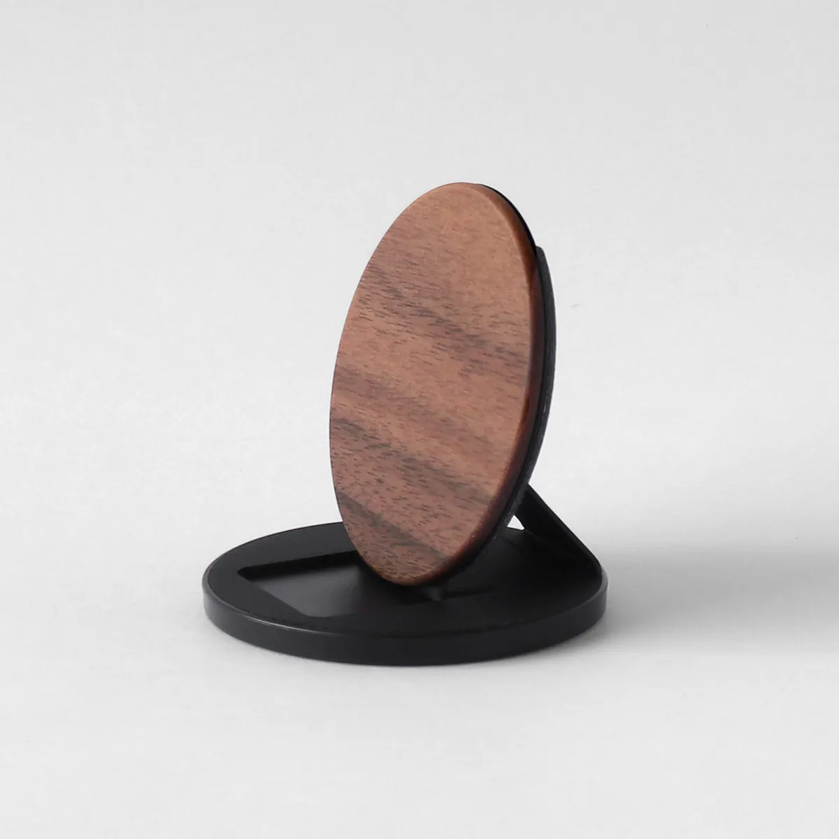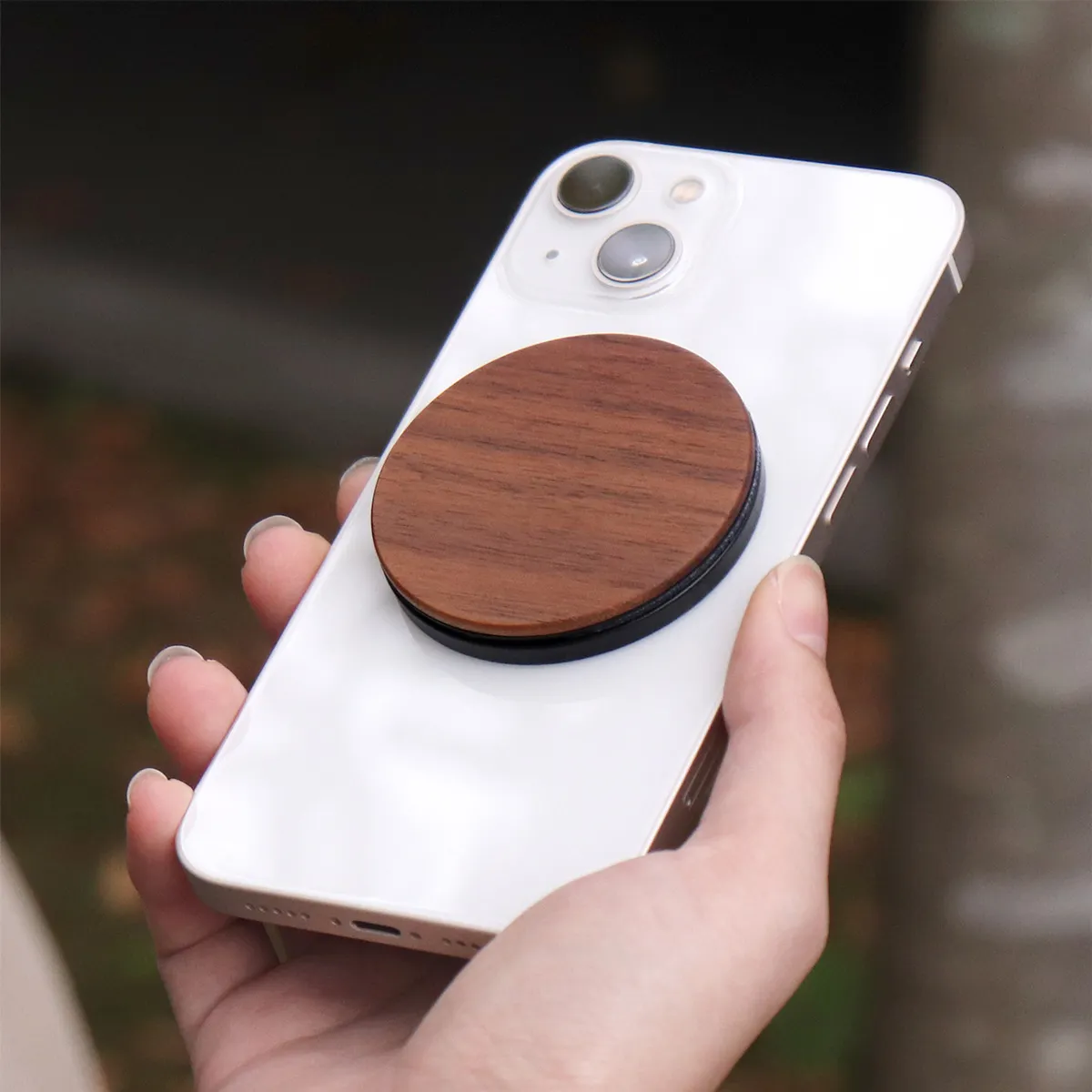 スタンドとしても、指をかけるリングとしても活躍する木製スマホスタンド。