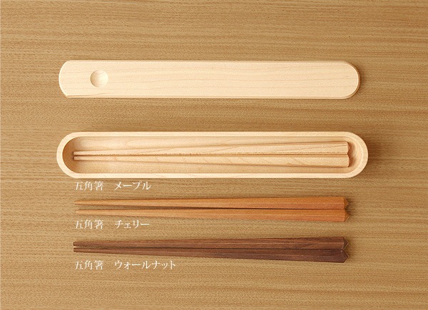 箸箱におさまる木製の五角箸をご用意しました、メープル・チェリー・ウォールナットからお選び頂けます。(別途料金:オプションからお選びください)